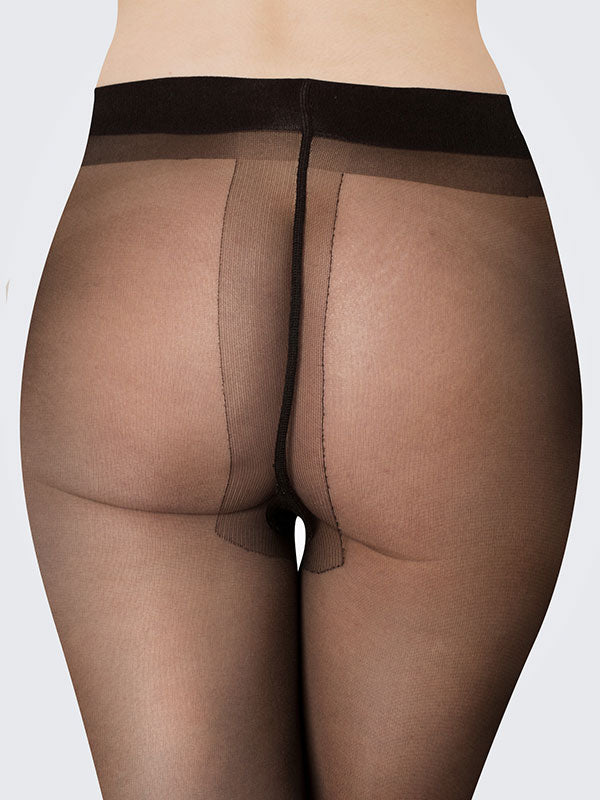 - 20 den sheer, very shiny (satin-like) black tights;