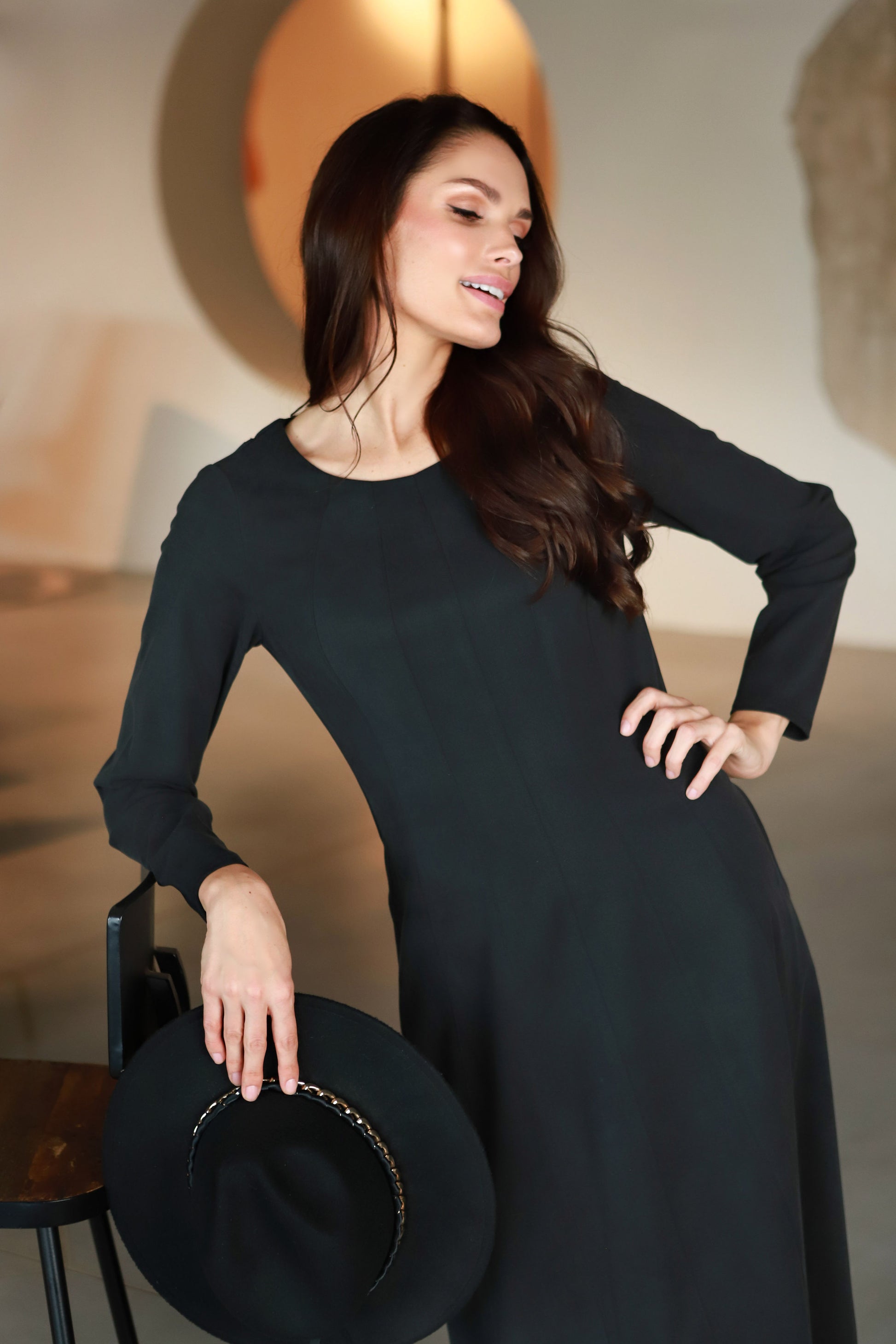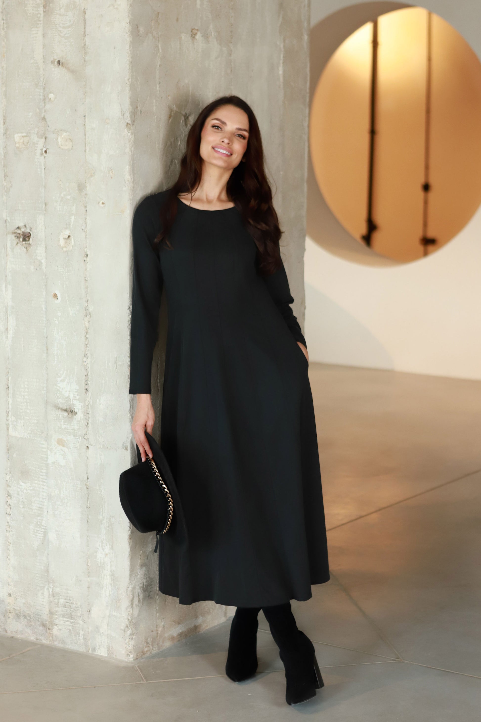 - Elegantiška ilga suknelė, pasiūta iš malonaus kūnui audinio;