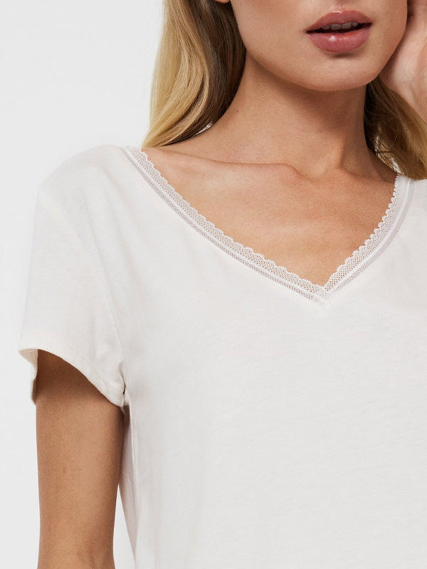 - глубокий V-образный вырез, украшенный кружевом;