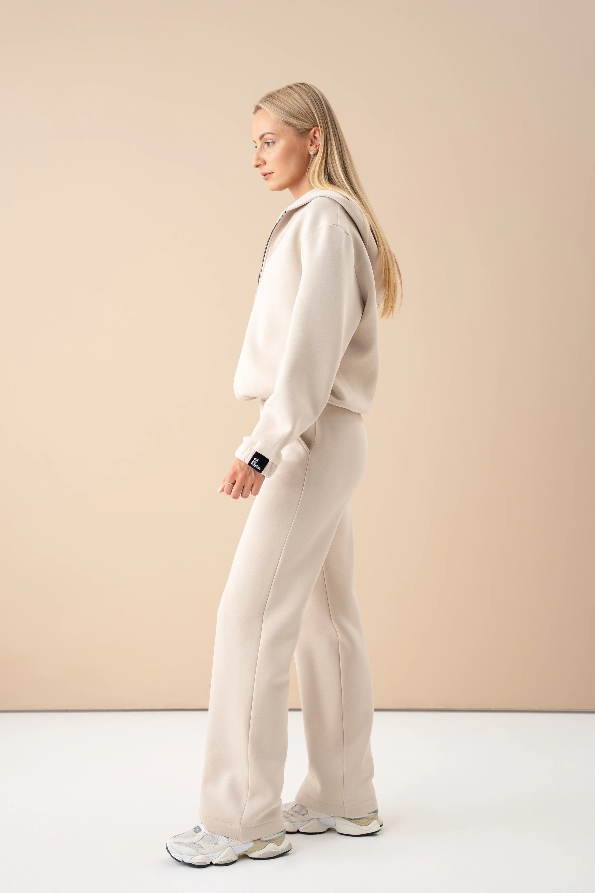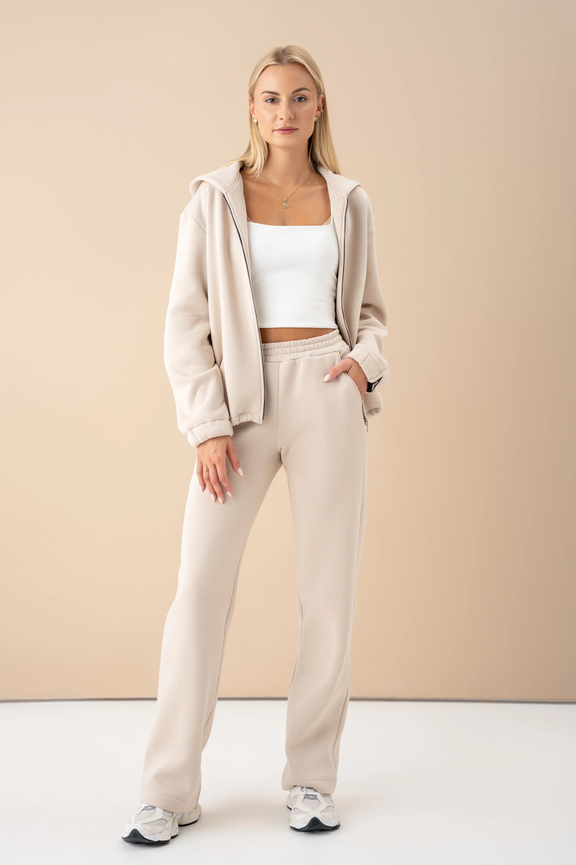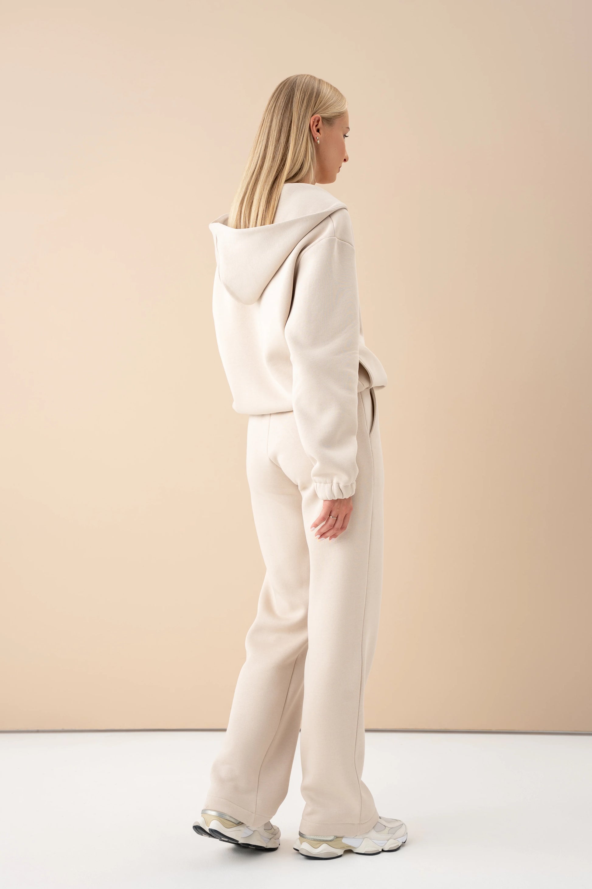 Когда хочется тепла и уюта, этот лаунж-костюм становится незаменимым выбором. Минималистичный дизайн и нейтральный оттенок позволяют сочетать его множеством способов – от спортивного до более элегантного образа. Он выглядит свежо, современно и дарит комфорт, необходимый каждый день.